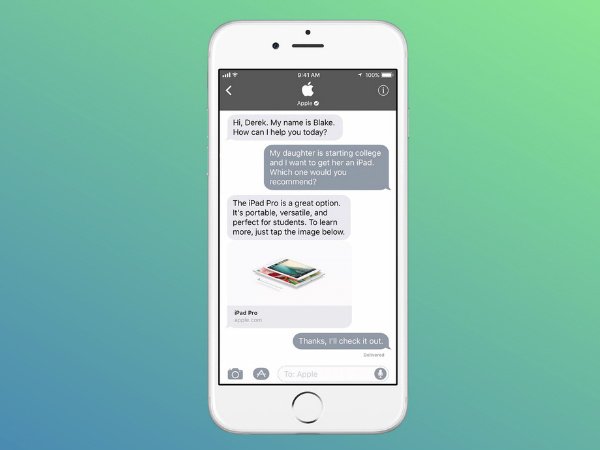 "বিজনেস চ্যাটের মাধ্যমে এবার গ্রাহকরা সরাসরি ব্যাবসাযীদের সাথে মেসেজের মাধ্যমে যোগাযোগ করতে পারবেন। এখন এই অ্যাপের বেটা ভার্সান লঞ্চ হবে আর এই বছর বসন্তে iOS 11.3 লঞ্চের সময় লঞ্চ হবে অ্যাপের ফুল ভার্সান।" বুধবার এই কথা জানিয়েছে অ্যাপেল।